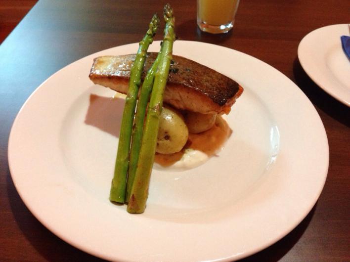 The salmon is well-done, and the asparagus is nice and crispy, but I’m not sure that tzatziki works here. I’ve had tzatziki with meat before, but not with fish.