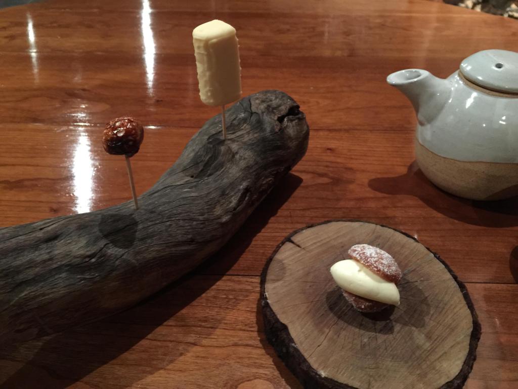 The crumble contains mushroom, and the clear jelly underneath contains pine needles, giving it a very odd and refreshing taste. Pine is something you often smell, but rarely eat. The creamy stuff on top contains a Seppeltsfield port. An interesting variety of gelatinous, creamy and soily textures. It reminds me of the forest floor, only palatable.