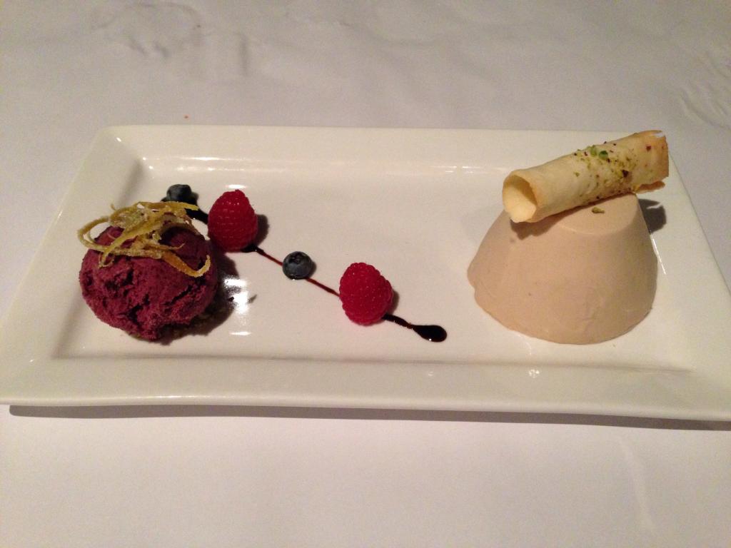 Vanilla & chai panna cotta with eggless blueberry gelato & pistachio wafer.