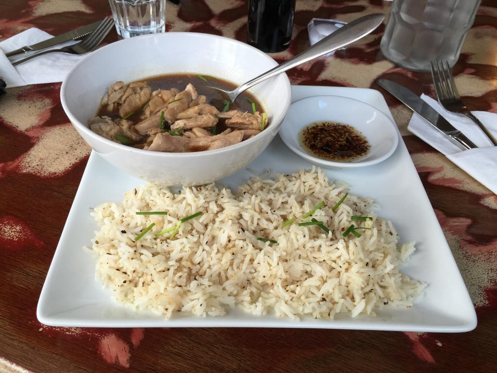 Free range chicken fillets cooked in ginger pandan broth, topped with sesame-tamari, and served with Asian greens, cucumber and ginger rice.