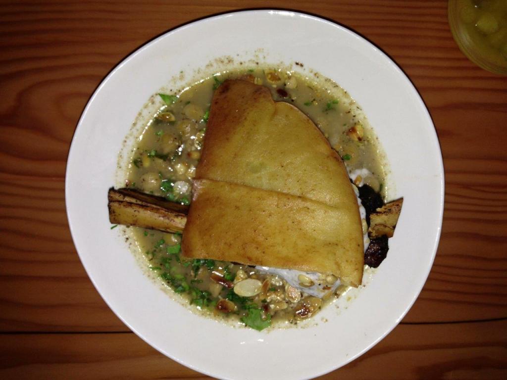 Spiced braised lamb shank, chickpeas, fried Lebanese bread, pine nuts, almond flakes and garlic yoghurt.